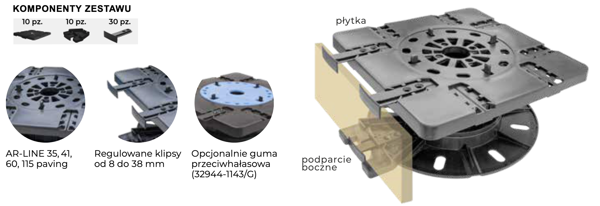 szt/karton1 zestaw (10 szt. płytek, 10 szt. podparcie boczne, 30 szt. klips regulacyjny)